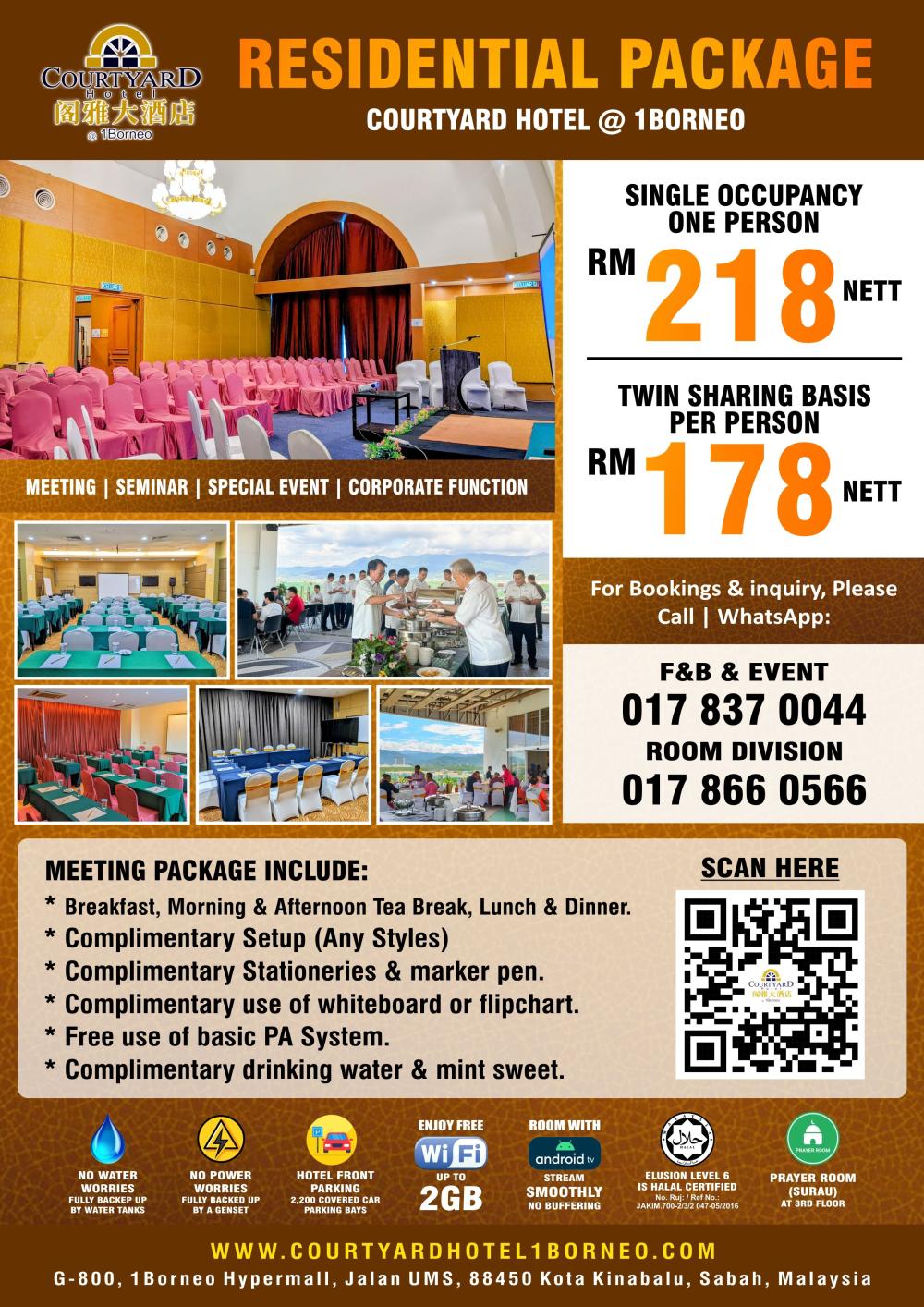 Whether for business or leisure, COURTYARD HOTEL @ 1 Borneo is designed to cater to your needs. For businessmen and corporate executives, we have our Deluxe Executive room with free in-room High Speed WIFI 1GB x 2 and complimentary WIFI in Courtyard lobby, Function Rooms and Elusion 6th Floor. For leisure shoppers or tourists, we have different grades and sizes of rooms to cater to budget travels, families and tourists travelling in group or FIT.